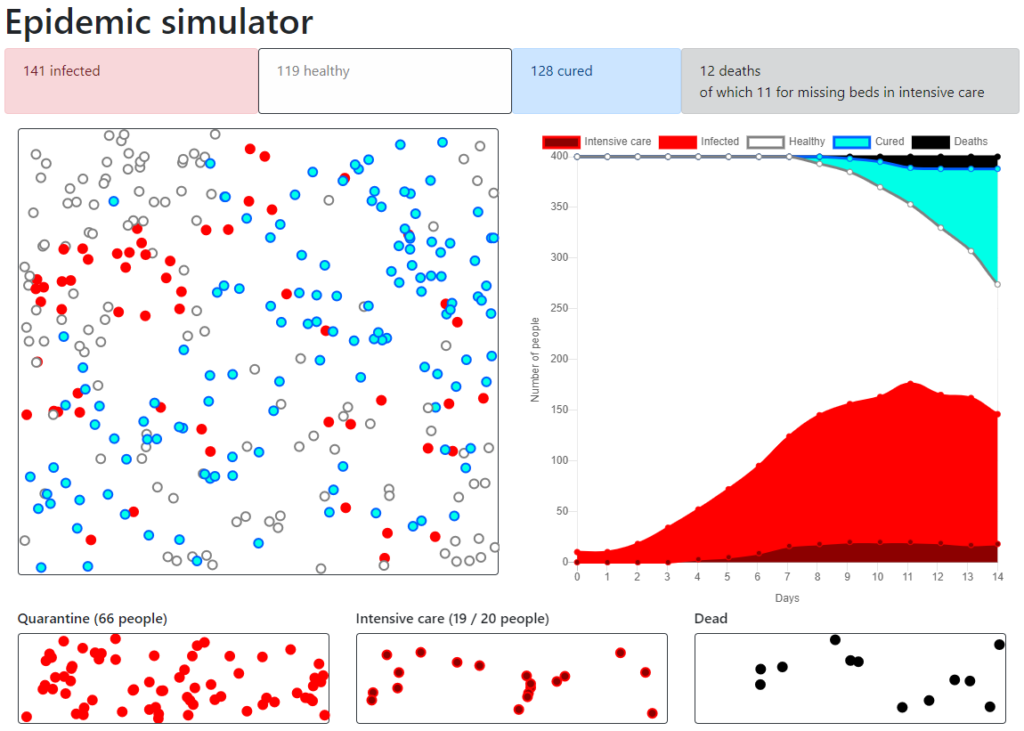 Developed a web epidemic simulator using JavaScript. The simulator allows to set parameters (e.g., infection rate, lethality, quarantine, intensive care, etc.) and shows how people moving in a space get infected with each other.