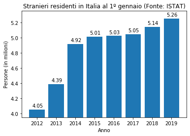 Iniziamo dai dati provenienti dall’Istat. Questi mostrano quante persone di cittadinanza non italiana abbiano dimora abituale in Italia. I dati vengono calcolati al 31 dicembre di ogni anno successivo al Censimento della popolazione.